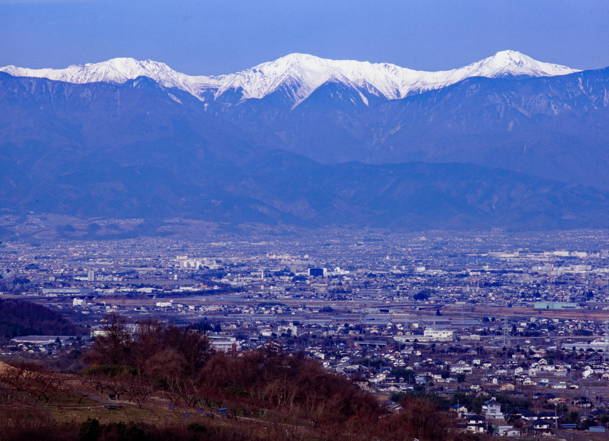 笛吹市八代ふるさと公園から撮影 右から北岳 間ノ岳 農鳥岳(白根三山)