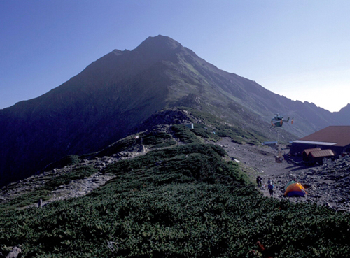 北岳 日本最高峰第2位の山 写真中に見える山小屋は村営北岳山荘ちょうどヘリコプターが下から荷物を運んできました、撮影場所は何時もここに来たらテントを張った場所から、山小屋から離れていますがここからの北岳の眺めが良いと自分では思っています。