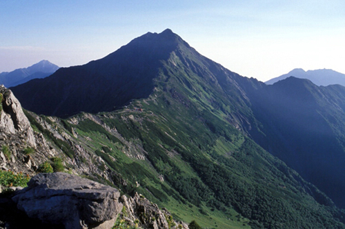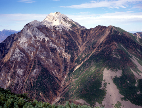 仙丈岳 北岳稜線から、冬とは違い緑色に染まっています比較的、山容をからすると楽に登れそうですがそうでもありません
