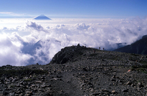 間ノ岳から富士山 3000m級の稜線万歩の醍醐味でしょうか夏雲の上に富士山そして間ノ岳の頂上の広いこと地図の案内には書いてありましたがこれほどとは!白根山三山縦走を終えて南アルプスの懐の深さに感激!大門沢小屋から奈良田第一発電所まで人が一人渡るだけのつり橋が幾つもありちょっと怖い事と、また後ろ左右を見回しながら景色を心の中に刻みつつ帰ってきました。