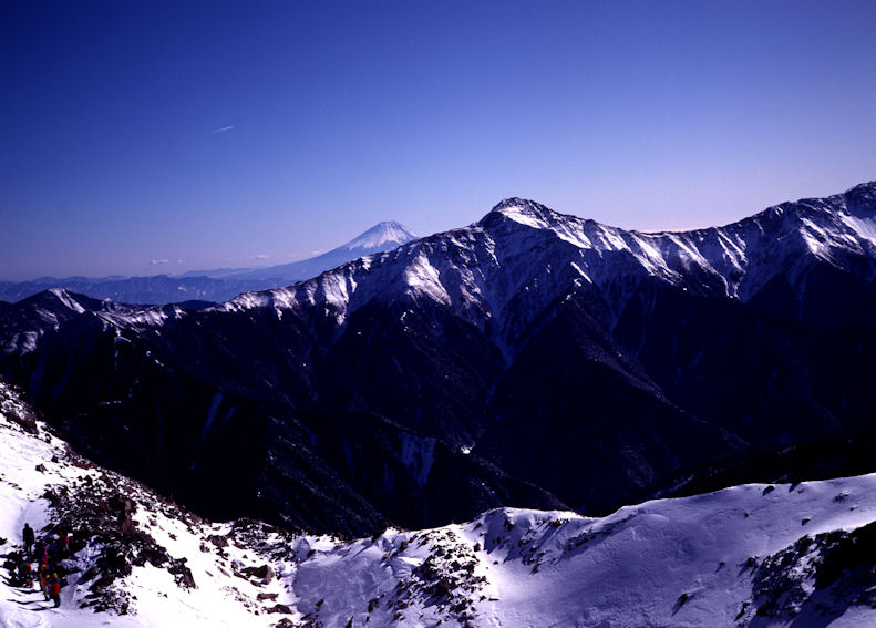 仙丈ケ岳頂上から北岳稜線小太郎尾根の向こうに見える富士山です