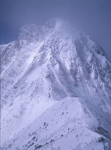 中岳手前から赤岳 昨日は雪が降る中、美濃戸口から入山 朝行者小屋を出るとき空を見上げると多少隙間があるものの、雲だらけせっかく来たのにと思いながら出発 ぼんやりと周りの景色しか見えない赤岳の頂上を踏んで阿弥陀岳へ行く中岳の手前から撮りましたこの日は北風が強い!